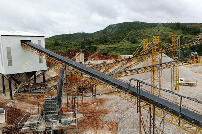 生產線流程:在石場現場,可以看到,原料經過錘式破碎機PCZ1615破碎之后被一條主輸送帶送到一組4YKZ3070振動篩進行篩分,篩分出三種成品料,不滿足粒度要求的物料被一條返料輸送帶送到整形破碎機PC1213中進行再次加工,加工后的物料被輸送到一臺振動篩再次篩分。